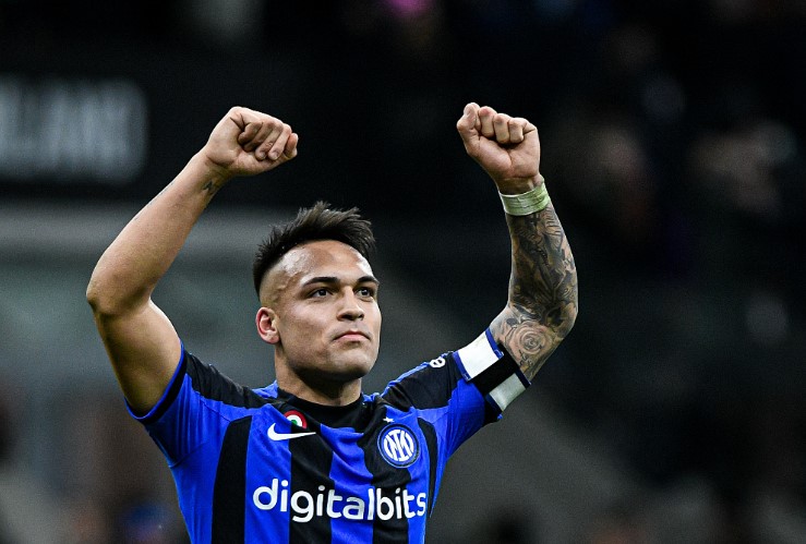 足球新闻:国吉祥坊际米兰的劳塔罗·马丁内斯在圣西罗对阵 AC 米兰的比赛后庆祝。