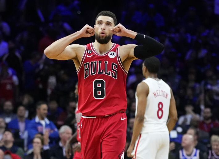 芝加哥公牛队的扎克拉文在对阵吉祥坊费城 76 人队的比赛中出界。