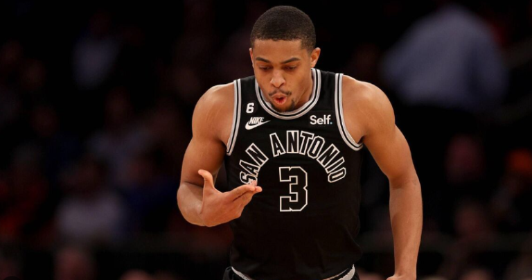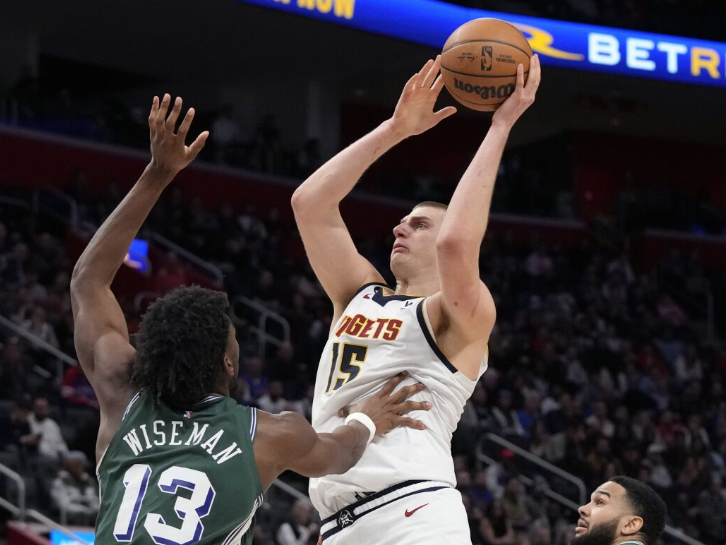 体育新闻:圣安东尼奥马刺队的卡尔登约翰吉祥坊逊在对阵丹佛掘金队的比赛中打进一球。