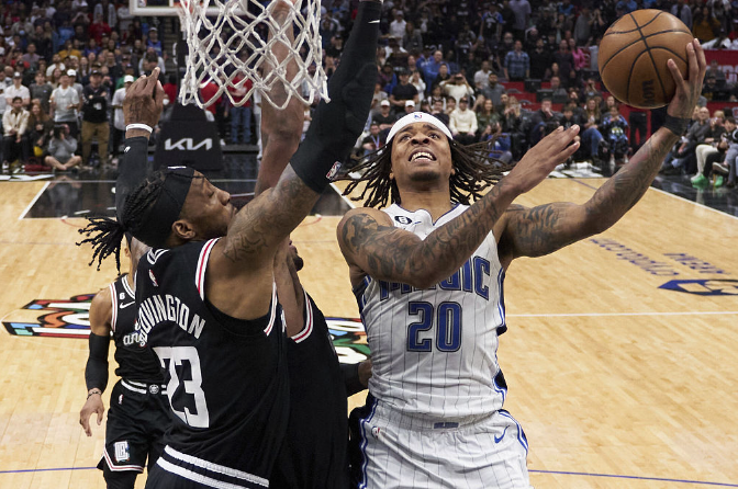 奥兰多魔术队的马克尔·富尔茨在对阵洛杉矶快船队的比赛中冲向篮筐