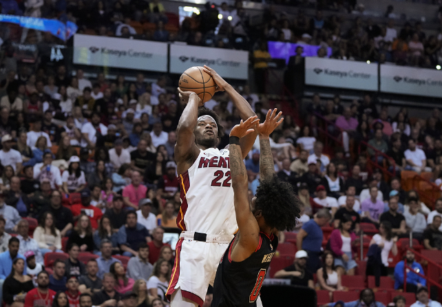 迈阿密热火队的吉米巴特勒在 NBA 东部联盟对阵芝加哥公牛队的比赛中投篮