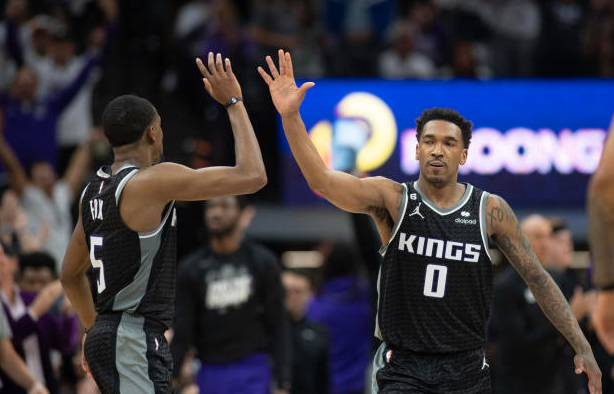 吉祥坊萨克拉门托国王队的马利克蒙克在 NBA 西部决赛首轮对阵金州勇士队的比赛中上篮。