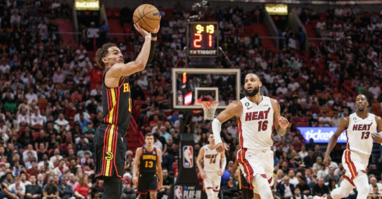 亚特兰大老鹰队的克林特卡佩拉在迈阿密的卡塞亚中心对阵迈阿密热火队。